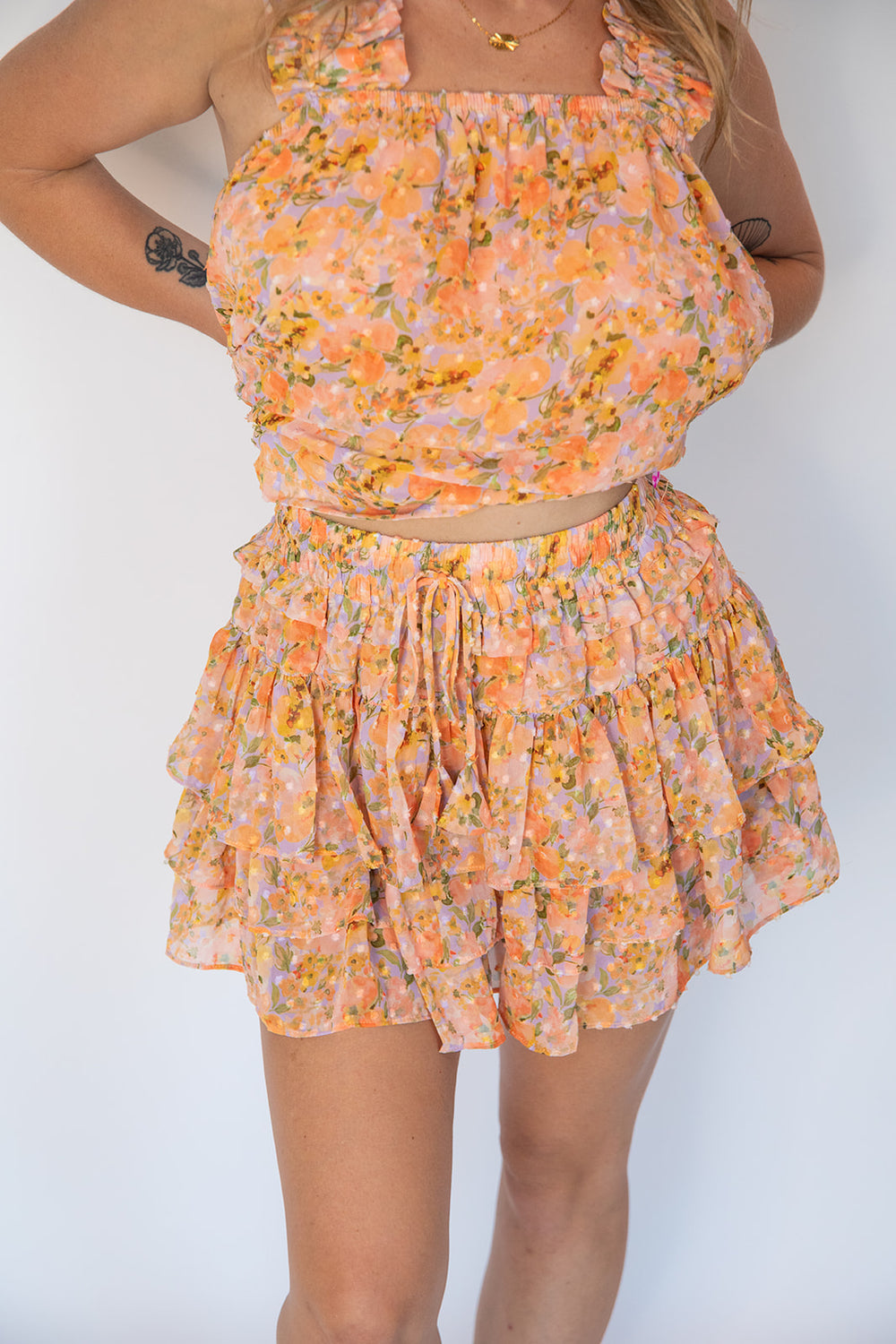 Introducing the Mila Skort with three ruffle tiers for a flouncy look. The waist tie and tassel tie give you versatile styling options, while the elastic waist and shorts lining add comfort to this ruffle skort. Look playful and chic with the Mila Skort!