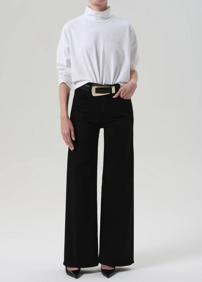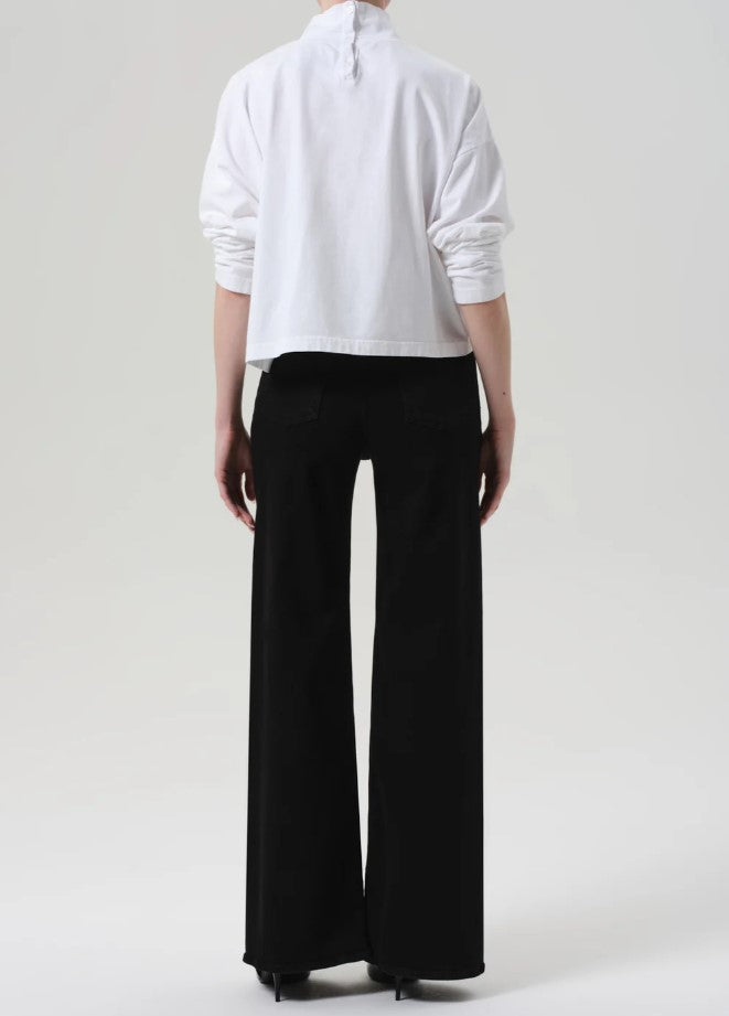 The Lyra is a vintage-inspired wide leg that sits high on the waist with a relaxed top block and full-length inseam. Crafted from soft stretch denim with a lightweight feel, Plush Black is a clean, true black wash that transitions seamlessly from day to night—style with classic sneakers or sharp heels.