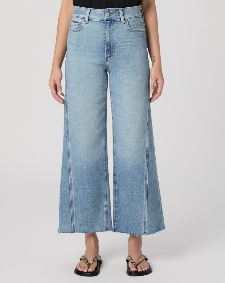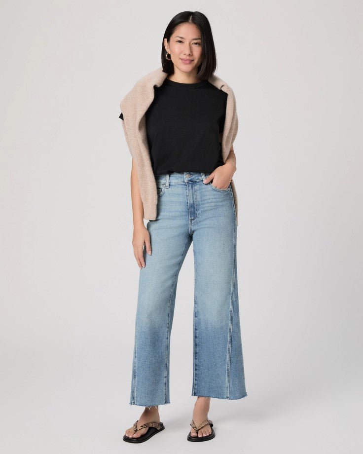 Anessa is Paige's high-waisted wide leg with a slightly relaxed fit and an ankle length inseam. Cut from TRANSCEND VINTAGE denim in a light wash with twisted outseam panels and a raw hem, this pair combines the signature comfort of Transcend with rich denim character for a lived-in look.