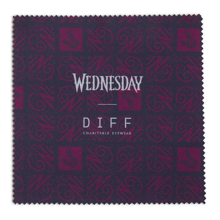 Moody, macabre, and totally the moment. The Wednesday Addams shades feature chic black frames in trendy thick acetate with a crystal clear layer to highlight Nevermore striping. The Nevermore Academy crest and iconic "I'm allergic to color" quote can be found at the temples.