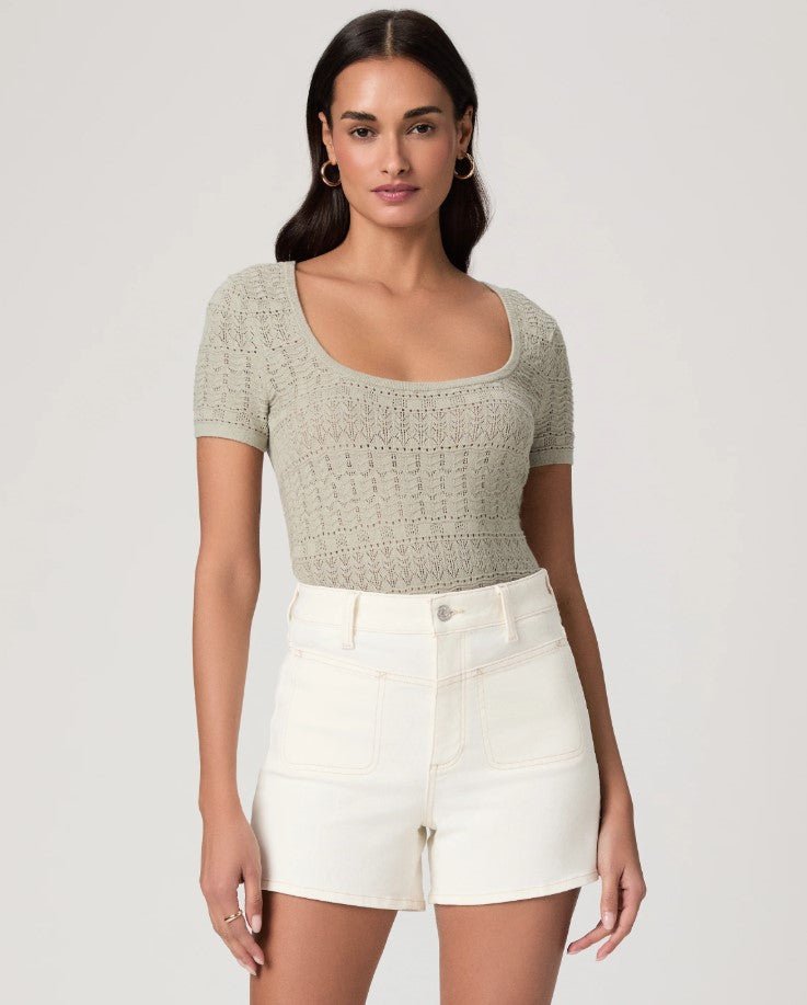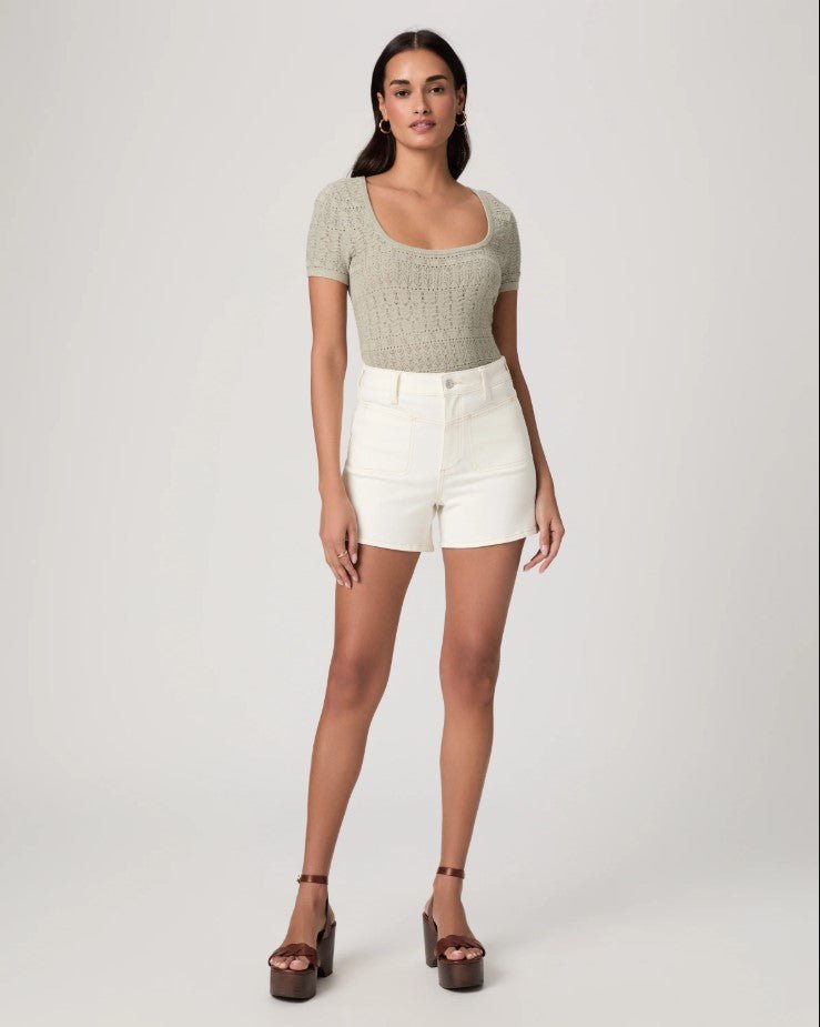 The Dani Short is designed with an ultra high-rise and a slightly A-lined silhouette. With a front yoke and stitch-through pockets, this pair is crafted from comfort stretch toasted ecru denim with plenty of coverage and the perfect amount of stretch.