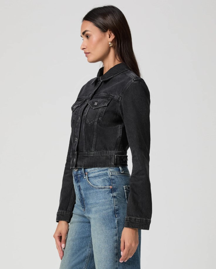 A classic denim jacket, crafted from 100% cotton in a coal black wash. This everyday layering piece is designed with a cropped fit, slanted seaming, pleated pockets, and silver buttons.