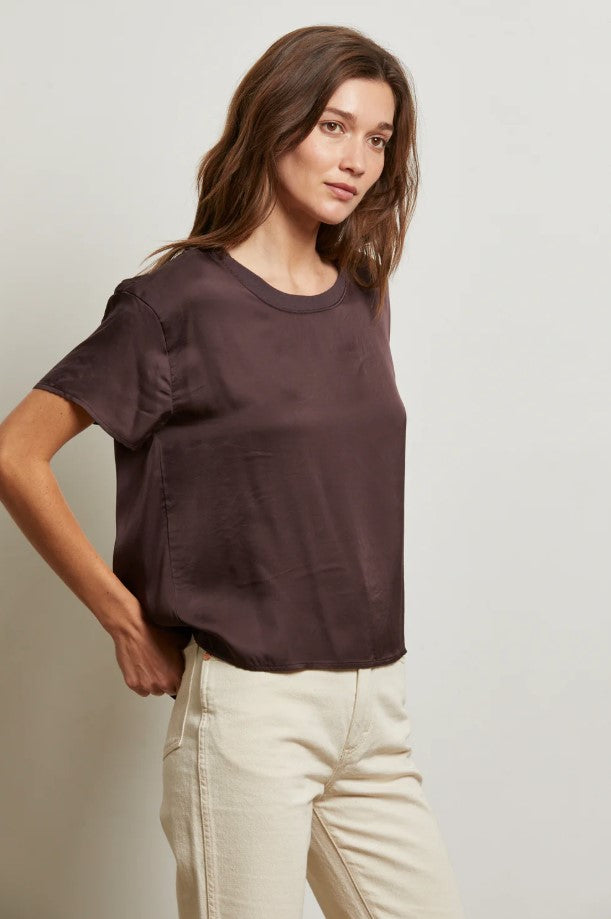 Not just a tee. Meet delphine; a classic crewneck tee shirt cut in whisper soft satin. Just what you’ve been wanting this holiday.