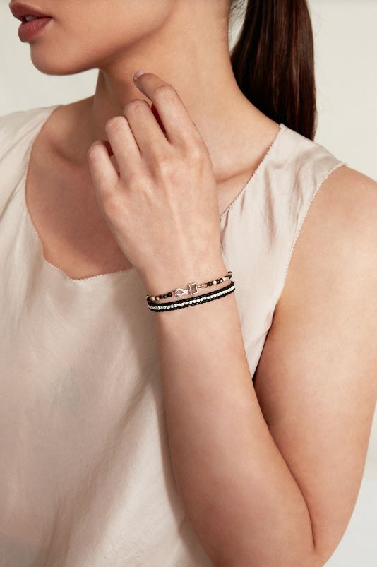 Pull tie bracelet featuring black mother of pearl and sterling silver labradorite hook.